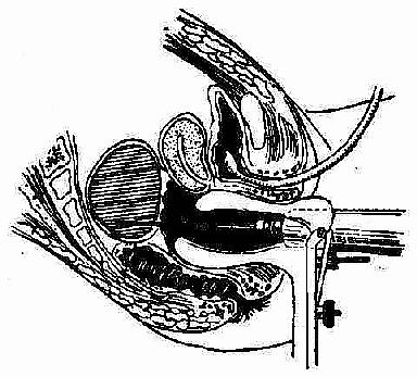 图2-44 截石位,臀部尽可能靠近手术台边缘。用手指徐徐扩张肛门后。将肛门扩张器轻轻插入肛门,到达直肠内撑开扩张器,看清直肠前面隆起部