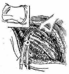 ③经侧胸部引流:适用于右肝上间隙的高位膈下脓肿,此途径须经过胸腔肋膈角部分,除非原有胸膜疾病此处已粘连闭合,否则均应分二期进行。第一期在侧胸部第8或第9肋处作切口并切除一小段肋骨直至胸膜。然后用碘仿纱布和酒精纱布填塞伤口,使引起周围粘连一周后再行第二期手术时即可在穿刺定位后,切开已粘连的胸腔肋膈角,直达脓肿置管引流。