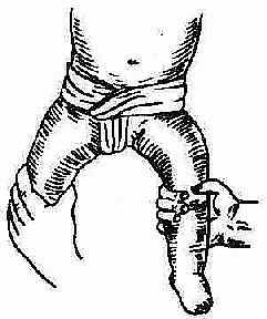 1.婴儿在长大过程中,腹肌逐渐强壮,部分有自愈可能,一般主张在一周岁内的婴儿,可暂不手术,先用棉线束带或绷带压迫腹股沟管内环,以防疝的突出(图2-25)。