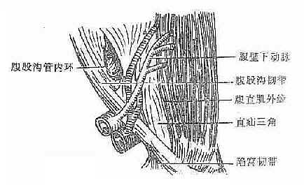 (三)直疝三角 又称Hesselbach三角。亦称腹股沟三角。直疝三角是由腹壁下动脉构成外侧边,腹直肌外缘构成内侧边,腹股沟韧带构成底边的一个三角形区域。此处腹壁缺乏完整的腹肌覆盖,且腹横筋膜又比周围部分为薄,所以是腹壁的一个薄弱区。腹股沟直疝即在此由后向前突出,故称直疝三角(图2-22)。直疝三角与腹股沟管内环之间有腹壁下动脉和凹间韧带(腹横筋膜增厚而成)。