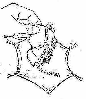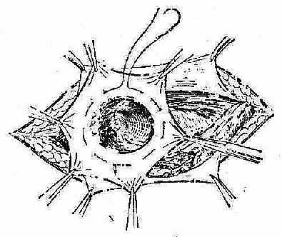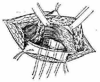 [治疗] 直疝多采用手术疗法。手术要点:加强腹内斜肌和腹横筋膜的抵抗力,以巩固腹股沟管的后壁。直疝修补方法,基本上与斜疝相似(图2-28、29)。常用 Bassini法,如果在手术过程中,发现腹横筋膜缺损很大,不能直接缝合时,可利用自身阔筋膜、腹直肌前鞘,以及尼龙布等材料,作填充缺损成形术。
