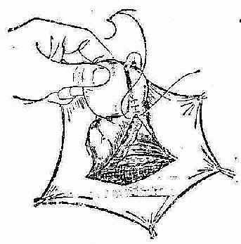 5.以血管钳夹位疝囊切口边缘几点,术前左手提起疝囊,左示指伸进疝囊内顶住囊壁,右手示指裹以盐水纱布,用钝力将疝囊与其周围组织和精索分离。精索动静脉与输精管位于疝囊外侧,与疝囊粘连,宜细心推开,特别要注意不可损伤静脉引起出血。大此处,不可盲目动力,以免切断或误伤输精管。