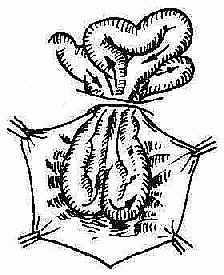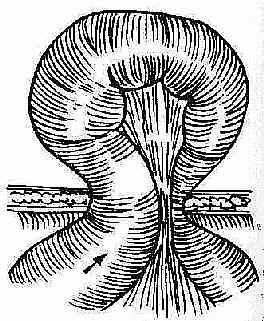 4.绞窄性疝:嵌顿性疝、如不及时解除,致使疝内容物因被箱闭后使内容物发生血循环障碍甚至坏死者,称为绞窄性疝。嵌顿和绞窄常多为一个肠段,但有时嵌顿的内容物为两个以上肠袢使肠袢呈W形状者称逆性嵌顿性疝(图2-18)。不仅在疝囊内的,而且在腹腔内的嵌顿肠管均可发生坏死。因此手术必需将全部嵌顿而发生病变的肠袢,拖出切口外作仔细检查,以防遗漏。