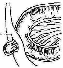 需要提出的是,如果嵌顿的内容物仅为肠壁的一部分,系膜侧肠壁及其系膜并未进入疝囊,称为肠管壁疝,或称瑞契(Richter)疝(图2-17)。如嵌顿的内容物为美克尔憩室,则称为里脱(Littre)疝。