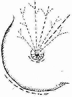 急性乳房炎脓肿形成期,治疗要则是及时切开引流,排出积脓。切开引流应注意如下要点:(1)为避免手术损伤乳管而形成乳瘘,切口应按轮辐方向作放射状切开,至乳晕处为止;深部脓肿或乳房后脓肿,可沿乳房下缘作弧形切口,经乳房后间隙引流之;既可避免乳管损伤,亦有利于引流排脓。乳晕下脓肿,应作沿乳晕边缘的弧形切口。(2)若炎症明显而未见波动处,不应消极等待,应在压痛最明显处进行穿刺,及早发现深部脓肿。(3)脓肿切开后,应以手指深入脓腔,轻轻分离其间的纤维间隔以利引流彻底。(4)为使引流通畅,可在探查脓腔时,找到脓腔的最低部位,别加切口作对口引流。(图2-12,2-13,2-14)。