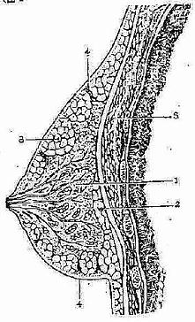 成年女性乳房系为一对称性的半球形性征器官,位于胸廓前第二至第六肋间水平的浅筋膜浅层与深层之间。乳腺是汗腺组织的一种类型,内达胸骨旁,外至腋前线,外上方呈角状伸向腋窝的腺体组织称为Spence氏腋尾区;在外科作乳癌根治切除时有重要意义,手术时的解剖境界必须包括上述范围。乳房中央前方突起为乳头,其周围色素沉着区为乳晕。