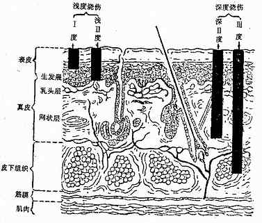 我国普遍采用三度四分法,即根据皮肤烧伤的深浅分为浅Ⅰ度、浅Ⅱ度、深Ⅱ度、Ⅲ度。深达肌肉、骨质者仍按Ⅲ度计算。临床上为表达方便,将Ⅰ度和浅Ⅱ度称为浅烧伤,将深Ⅱ度和Ⅲ度称为深烧伤(图1-51)。