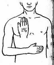 (2)手掌法:五指并拢,手掌面积即占全身体表面积的1%,此法不论年龄大小与性别,均以伤员自已手掌面积的大小来估计(图1-50)。对小面积的烧伤直接以手掌法来计算,大面积烧伤则以手掌法减去未烧伤的面积,使用更为方便。