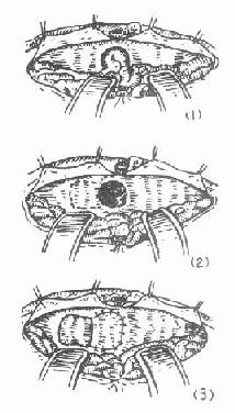 手术方法可以从颅外与颅内进行,颅外法适用于枕部、顶部膨出及个别的鼻根部骨缺损较小的病例;颅内法主要用于颅底鼻根部、鼻咽部或眼眶部膨出(图4-48,49)。或采取联合手术。