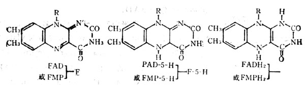 FMN或FAD与酶蛋白结合,一般是通过 8位上的亚甲基与酶蛋白上的半胱酸、组氧酸或氨酸相联结。(图5-20)。维生素B2辅酶有三种功能形式图5-21。