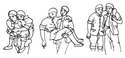 (一)单人搬运法 适用于伤势比较轻的伤病员,采取背、抱或扶持等方法(图32)