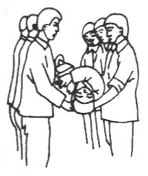 (四)多人搬运法 对脊椎受伤的患者向担架上搬动应由4~6人一起搬动,2人专管头部的牵引固定,使善始终保持与躯干成直线的位置,维持颈部不动。另2人托住臂背,2人托住下肢,协调地将伤者平直放到担架上,并在颈、国窝放一小枕头,头部两侧用软垫沙袋固定(图34)。