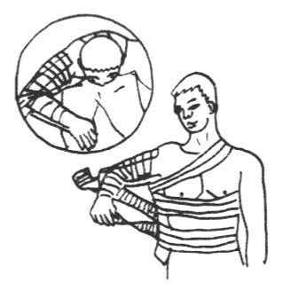 4.前臂骨折固定:用两块木板,一块放前臂上,另一块放背面,但其长度要超过肘关节,然后用布带或三角巾捆绑托起(图28)。
