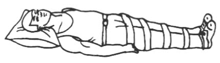 5.股骨骨折固定:用木板2块,将大腿小腿一起固定。置于大腿前后两块长达腰部,并将踝关节一起固定,以防这两部位活动引起骨折错位(图29)。