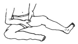 7.大腿以下出血:自救用双拇指重迭用力压迫大腿上端腹没沟中点稍下方股动脉搏动处(图13)。