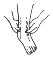 8.足部出血:用两手指或拇指分别压迫足背中部近踝关节处的足背动脉和足跟内侧与内踝之间的胫后动脉(图14)。