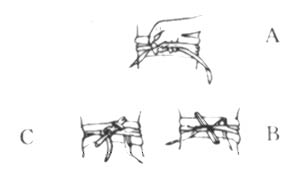 1.橡皮止血带止血法:在肢体的恰当部位如股部的中下1/3、上臂的中下1/3,用纱布、棉布或毛巾、衣服等物作为衬垫后再上止血带。用左手的拇指、食指、中摾持止血带的头端,将长的尾端绕肢体一圈后压住头端,再绕肢体一圈,然后用左手食指、中指夹住尾端后,将尾端从止血带下拉过,由另一缘牵出,系成一个活结(图18)。