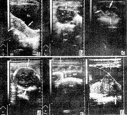 a.正常子宫(↓) b.卵巢皮样囊肿(↓) c.妊娠(↓)d.胎头光环(↓) e.子宫前壁胎盘(↓)f.前置胎盘(↑为子宫内口) BL.膀胱 UT.子宫 C.囊肿 P.胎盘 AM.羊水FA.胎儿