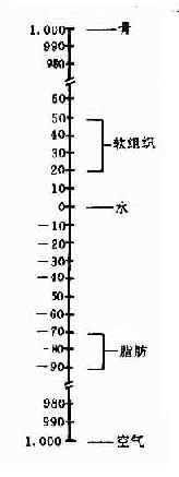 水的吸收系数为10,CT值定为0Hu,人体中密度最高的骨皮质吸收系数最高,CT值定为+1000Hu,而空气密度最低,定为-1000Hu。人体中密度不同和各种组织的CT值则居于-1000Hu到+1000Hu的2000个分度之间(表1-2-1)。