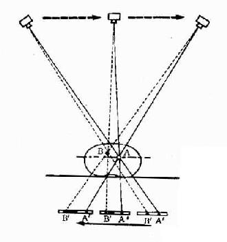 在曝光时,X线管与胶片作相反方向移动,而移动的轴心即在选定层面的平面上。结果,在被检查的部位内,只有选定的一层结构始终投影在胶片上的固定位置(A'),从而使该层面的结构清楚的显影,而其前后各层结构则因曝光时,在胶片上投影的位置不断移动而成模糊影像(B')