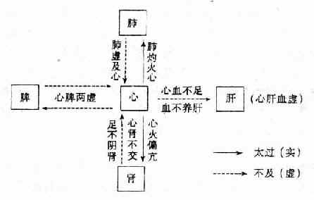 2.心与肾的关系 心属阳,位居于上,其性属火。肾属阴,位居于下,其性属水,生理情况下,心阳须下降于肾,以资肾阳,共同温煦肾阴;肾阴上济于心,以资心阴,共同滋养心阳,阴阳互相制约,使心阳不亢,心与肾保持这种“水火相济”,“心肾相交”的关系。如果这种正常关系受到破坏,就会出现心悸、失眠、健忘、多梦、遗精等“心肾不交”的证候。
