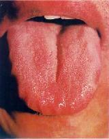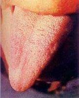 (3)润燥:反映体内津液的情况。正常舌苔不干不湿,无苔干燥为体内津液已耗,外感病多为燥热伤津,内伤病多为阴虚津液不足;舌苔湿润表明津液未伤,而苔面水份过多伸舌欲下滴,称为滑苔,则示体内有湿停留。