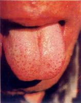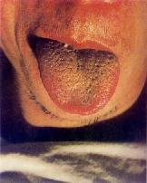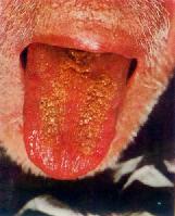 ③灰黑苔 多主热证,亦有寒湿或虚寒证。舌苔灰黑而干,为热盛伤津;舌苔灰黑而湿润,多属阳虚寒盛。灰黑苔多见于疾病比较严重的阶段。
