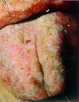 舌象:舌质淡红、苍老、白苔满布、微黄、粗糙如砂石。