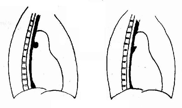 以上各型亦可混合出现,综合食管癌中晚期的X线表现,其癌瘤处管腔轮廓不规则,有充盈缺损,不对称性狭窄或溃疡形成。癌处的粘膜皱襞破坏,管壁僵硬,蠕动消失、钡剂通过缓慢,常有不同程度的梗阻,其上方食管扩张(图5-15)。有时可在癌肿处显示软组织包块影。
