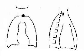 ③器官变形:十二指肠溃疡常见球部变形(Bulb deformity)。因球部较小,溃疡周围的炎症水肿、肌肉痉挛、瘢痕收缩及周围粘连等原因,容易使球部失去正常形态。典型的球部变形呈山字形、花叶形等(图5-26)常见其内有一个钡点状龛影。因溃疡较小,加之变形,故龛影显示率较低(约60%上下)。溃疡愈合后,因炎症或痉挛所引起的变形可恢复正常形态。