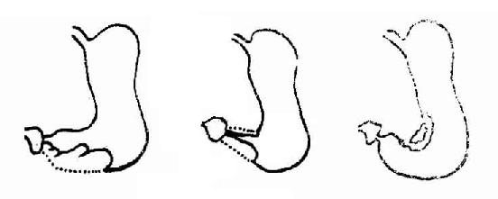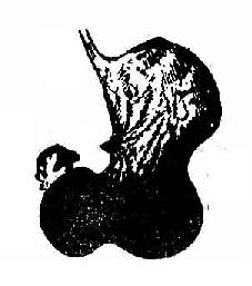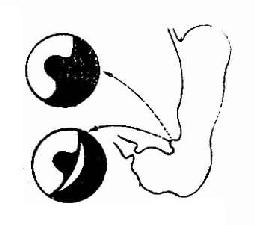 溃疡引起胃部变形者少见,少数患者因痉挛或瘢痕较著,引起下述胃部变形:胃小弯溃疡时,对侧大弯出现挛或瘢痕性迹,状如B字(图5-27)。当发生瘢痕收缩时,可使小弯缩短,胃窦大弯形成囊状扩张,使胃形如蜗牛。胃窦部溃疡可使胃窦狭窄变形。