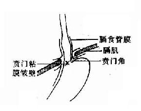 食管下段有一高压带,其高压由多种因素组成,即1.食管裂孔处膈肌弹性夹簧的作用,通常呈收缩状态,仅食团向下推进时才开放。2.腹段食管左缘与胃底大弯相交成锐角,是为食管胃角,又称贲门切迹,经常处在收缩状态。3.贲门处的星状粘膜皱襞(图5-16)。此处还有一解剖要明确,正常时食管鳞状上皮与胃柱上皮相交处X线是看不到的,内窥镜能见到为齿状线。当有疝时,X线就可看到在食管与胃交界处呈对称的切迹,称为食管一胃环。4.膈食管膜为食管下段周围的一层纤维膜,起一支持保护作用。就是上述诸因素的综合作用,才阻止胃内食物向食管反流。