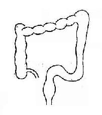 大肠包括盲肠、结肠和直肠、盲肠为回盲瓣入口下方的盲囊,阑尾位于内下侧。结肠分升、横、降、乙状结肠、肝曲和脾曲。肝曲一般较脾曲位置低。盲肠和结肠有结肠袋,钡剂充盈后呈多数半园形膨出袋囊,结肠袋以升、横结肠较显著,降结肠以下就逐渐不明显。直肠没有袋形,边缘光滑,其中间最宽处称壶腹部(图5-7)