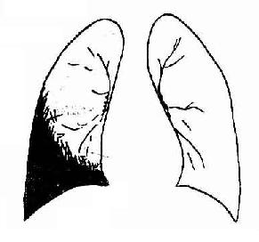 X线表现:少量气胸在肺尖部显示无肺纹的透光区。被压缩的胸膜脏层如与肋骨重叠,则难以发现。大量气胸可将肺向肺门方向压缩。呈密度均匀的软组织影,由于它含气量减少致透光度减低,肺纹聚拢,其边缘有脏层胸膜形成的纤细的致密影,呼气时清楚,同时可见纵隔向健侧移位,患侧横膈下降,肋间隙增宽。张力性气胸时,可发生纵隔疝。如有胸膜粘连,可见该处肺不被压缩,呈条状阴影与胸壁相连。健侧肺可有代偿性肺气肿。
