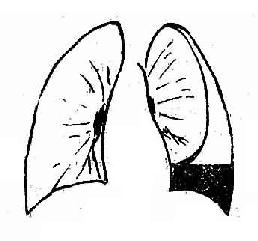 (3)肺下积液(Infrapulmonary effusion)聚积在肺底与膈之间的积液为肺下积液。多为单侧,以右侧多见。因液体将肺下缘向上推移,故X线表现为肺下野密度增高,与膈影相续,而上缘呈上突的圆顶状,易误为膈升高。但肺下积液有以下特点:①“膈圆顶”最高点偏外侧1/3,肋膈角变深、变锐;②透视下见肝脏下界位置正常;③仰卧位透视,由于液体流至背部胸腔,表现为患侧肺野密度均匀增高,同时可见患侧膈顶位置正常。并无真正升高。④向患侧倾斜60o时,可见游离积液的征象;少数肺底胸膜粘连,而液体不能流动,X线见之如球形影,此时可做超声检查或人工气腹以确定诊断。