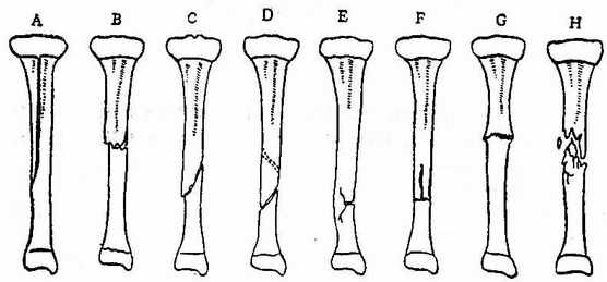 E.青枝骨折 F.“T” 形骨折 G.嵌入骨折 H. 粉碎性骨折