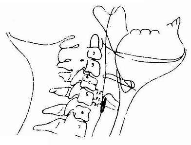 包括鼻咽部、口咽部、喉咽部及食管上端。在侧位片上颈椎前的咽后壁软组织显示清楚。儿童期因淋巴腺样体发达而较厚。成人腺样体萎缩变薄,其下端厚约0.5cm,由下向上渐变厚,相当于第一颈椎平面处咽后壁的厚度约为1.5cm(图2-7)