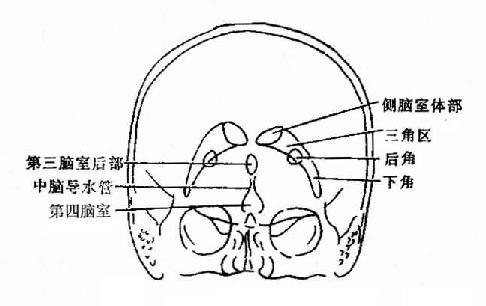 4. 四脑室在侧位片上,呈三角形,底在前,顶向后上,在后前位片上,呈菱形,位于中线。