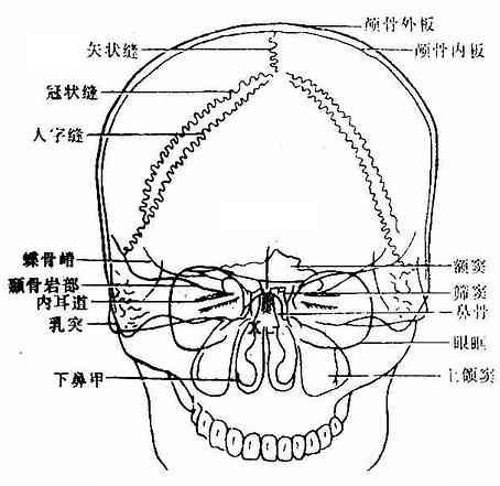 为两块颅骨衔接处,呈锯齿状。额、顶骨间为冠状缝,顶、枕骨间为人字缝,都可在侧位片中显示清楚。颞、顶间为鳞状缝,侧位片中能见度较差。颅缝间多余的骨块,为缝间骨(Wormian bone),多见于人字缝,不可误认为骨折。颅缝宽度不超过2mm,随年龄增长而逐渐变窄。冠状缝、人字缝和矢字缝约30岁闭合。