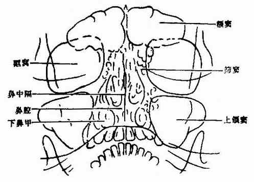 筛窦位于鼻腔和两眼眶间的小蜂窝状影,为筛窦前群。筛窦后群在此位置中位于眼眶内下方并与鼻腔侧壁重迭,不易观察。