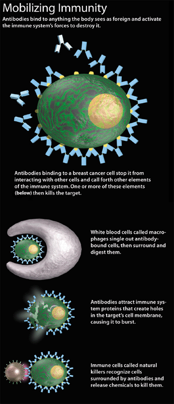 研究人员已经长期盼望诱导抗体去治愈或治疗免疫系统疾病,这些免疫系统疾病既包括可被忽略的癌症,也可包括病理性疾病,如类风湿关节炎、红斑狼疮和其它自动免疫疾病。生物学家几十年来已经知道,带有人类癌细胞或甚至带有从一个细胞来的单一蛋白的免疫鼠,它将产生抗击外来入侵的自身抗癌抗体去应答外来入侵。如果你一次又一次地注射癌细胞,那么你的模型鼠将产生抗体极其精确地专一到达你注射癌细胞的靶点。
