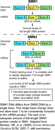 以脊柱运动神经元的死亡和随后的肌肉瘫痪为特征的脊柱肌肉萎缩(SMA)是一种引起儿童致命的最普通遗传神经肌肉疾病。SMA发生的年令和严重性从由呼吸衰竭引起早期死亡的婴发生期(I型)到减少预期寿命(2型)、不能行走(2型、3型)的青少年温和发生期各不相同。