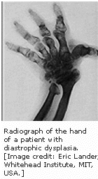 发生在DTD中的基因突变定位于染色体5并编码一种新奇的硫酸盐运输者。它与DTD患者在不同组织中观察到的不寻常硫酸盐浓度相匹配。因为作为关节减震器的软骨,在它制造过程中需要硫酸盐,所以硫酸盐对骨关节是重要的。在软骨中添加负电荷有助于减震作用。