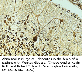 门克氏综合症是一种标志细胞吸收铜能力减弱的先天性代谢缺陷,特点为大脑严重变性及动脉病变,导致在婴儿期死亡。头发稀疏发脆并在显微镜下呈卷缩状。