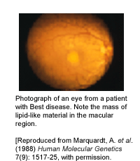 BEST疾病是一种常规染色体显性,换句话说,位于染色体11上VMD2基因的唯一复制发生突变可能引起疾病的发展。在他们失去视力前,具有这类疾病的患者在对应中心视觉的视网膜区域中积累了大量类似蛋黄(卵磷脂即是蛋黄的意思)物质。与其说打破了这些物质倒不如说形成与BEST疾病有关的逐渐丧失视觉的特征。