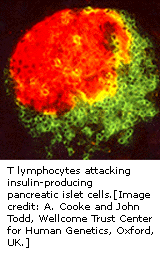 在I型糖尿病人中,人体免疫系统设置一种免疫,攻击它自身胰岛素和制造胰岛素的胰管细胞。然而,如何发生的机理还不清楚。