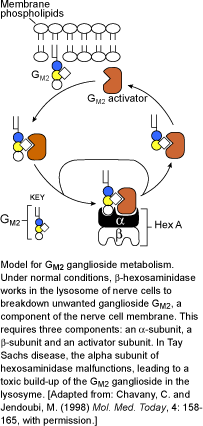 一种和Ashkenazi Jews有关的遗传性代谢障碍泰-萨病也已在Ouebec东南的法国加拿大人,Louisiana西南的Cajuns人和世界的其他人群中发现。泰-萨病表现的严重性从婴儿到青少年随年令不同有所变化,形成麻痹、痴呆、视觉缺损、和早期死亡,或在漫长的成年期形成神经功能性障碍和精神病。