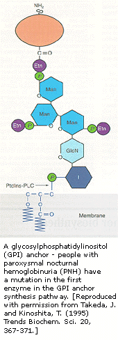 在PNH血细胞中缺少一种称之为PIG-A的酶,它需要细胞抗基的生物合成。一部分在细胞外面的蛋白质经常被糖基磷基醯肌醇(GP1)抗基束缚于至细胞膜上。如果PIG-A缺乏的话,保护细胞免受血液中结构成分破坏的表面蛋白不会被固定,因此就缺少束缚能力,所以血细胞就被分解了。