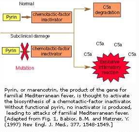 在1997年,研究人员确认FMF基因并找到引起遗传性风湿病的几种不同基因突变。在染色体16上发现的基因给蛋白质作了编码,它几乎只有在对免疫应答起重要作用的白细胞上的粒细胞中发现。这种蛋白质可能在无“制动闸”作用的失活免疫应答控制下正常参与炎症产生过程。一种不适宜的全快速炎症反应就发生:FMF侵袭。