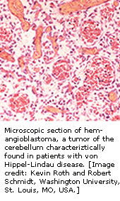 VHL疾病的基因定位于染色体3上,以显性方式遗传,如果父母一方有一种显性基因,那么他(她)的下一代就有50%的机会遗传那种基因.VHL基因是一种肿瘤抑制基因,这就意味着它在正常细胞中的作用是停止无控止的生长和增殖.如果VHL基因失去或突变,那么它对细胞生长的遗传影响就是失去或缩小与其它调节蛋白缺陷结合的能力,能引起癌生长.就象Rb肿瘤抑制基因那样,VHL似乎对肿瘤基因的多步骤过程起着"守门员"作用.虽然未涉及任何其它人类蛋白的已知家系,但在小鼠和鼠中找到了人类VHL的同源性,运用这些动物作为人类疾病模型有机体的实验正在帮研究人员发现VUL的正常的生理作用,通过这种发现可洞察它的发病机理.初步结果认为VHL在调节细胞环的出口形式方面起作用.